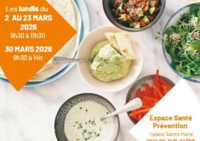 Cycle de 5 séances animé par Marion Donny, diététicienne-nutritionniste : 4 séances de 2 heures (les 2, 9, 16, 23 mars) et une séance de 4 heures 30 (le 30 mars) avec préparation et dégustation d'un repas complet et équilibré